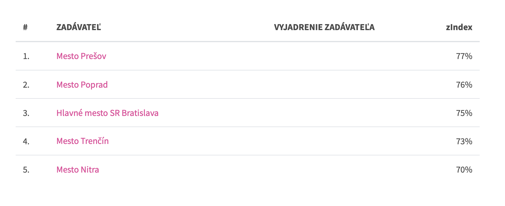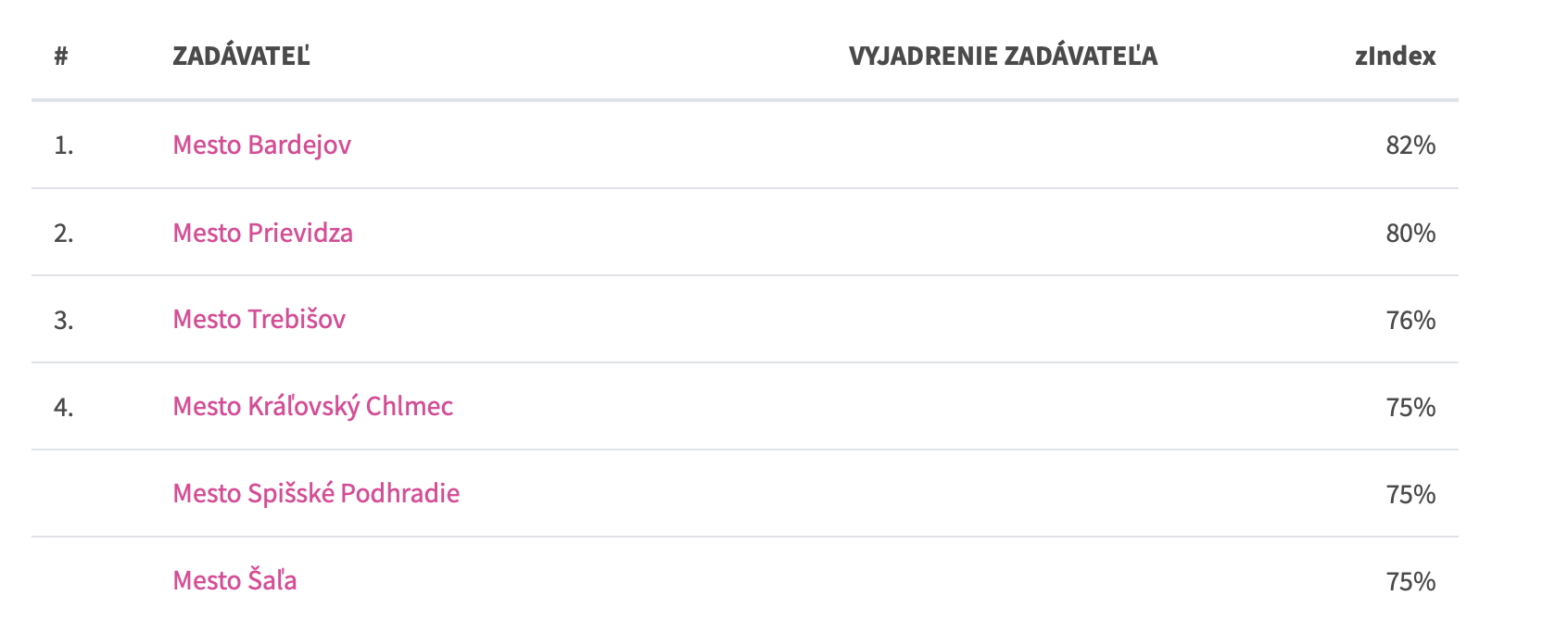 Samozrejme, nedá sa obsiahnuť všetko, ale Zindex dáva obstarávateľom vysvedčenie, ako sa im darí v porovnaní s ostatnými. Verejnosti a občanom zase Zindex poskytne informácie, ako ich volení zástupcovia nakladajú s verejnými zdrojmi,povedala riaditeľka Nadácie Zastavme korupciu Zuzana Petková. Dobrý výsledok tiež podľa nej neznamená, že v meste sa v súvislosti s nakupovaním nikdy nevyskytla žiadna kauza.