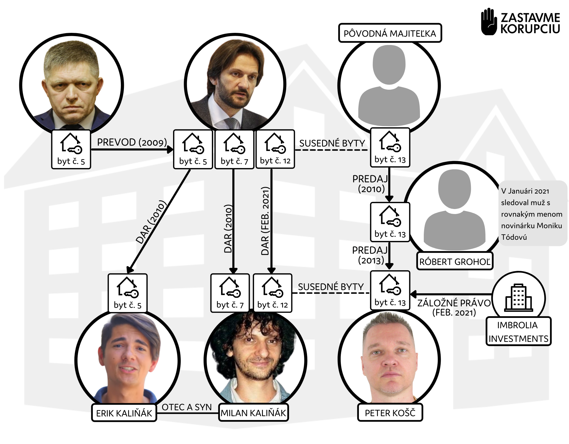 Osud bytov Kaliňáka a Košča na najvyššom poschodí postihli začiatkom tohto roka radikálne zmeny. Udialo sa tak tesne predtým ako Košča obvinili. Košč svoj byt vo februári založil, Kaliňák v rovnakom mesiaci daroval svojmu bratovi.