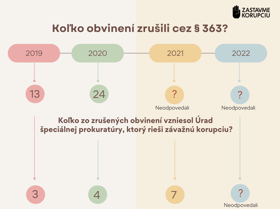 Ani na otázku, koľko bolo za posledné roky takýchto prípadov, GP neodpovedala. „Nedisponuje informáciou, „tzv. ležiacou na stole“, z ktorej by bolo možné bez ďalšieho preskúmania zistiť, či návrh na postup podľa paragrafu 363 smeroval proti uzneseniu o začatí trestného stíhania vo veci,“ uviedla.