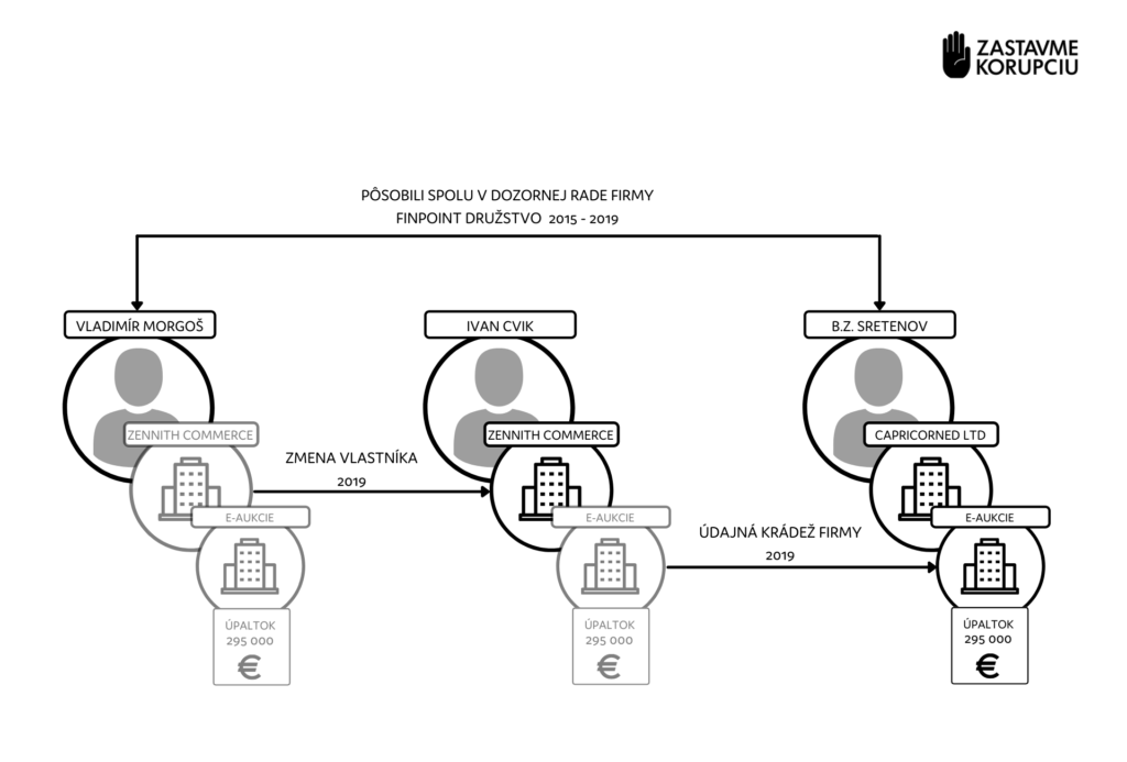 Vo firme E-aukcie však prišlo k zvláštnym zmenám vo vlastníckej štruktúre. Firmu, do ktorej podľa obžaloby tiekol aj takmer 300-tisícový úplatok, vlastnil odsúdený Vladimír Morgoš prostredníctvom londýnskej schránky Zenith Commerce. Krátko po razii na Okresnom úrade sa majiteľom schránky a teda aj firmy E-aukcie stal Ivan Cvik.