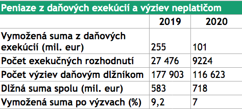 V rukách FS ale stále ostávajú mladšie dlhy, kde je šanca niečo vymôcť. Tu je možná daňová exekúcia až 20 rokov od vzniku dlhu. Štatistiky FS ukazujú, že ročne rozbehne tisíce exekúcií. Aj vlani, napriek Covid odkladom daňových povinností, z exekúcií vymohla cez 100-miliónov eur. Čo je slušné číslo, no stále v porovnaní s celkovými dlhmi nízke.