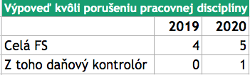 Prípadov, kedy sa FS ,,rozlúčila“ zo zamestnancami pre porušenie alebo nedodržanie pracovnej disciplíny, bolo na druhej strane vlani päť. Rok predtým štyri. A čo sa týka napríklad zlyhania pri práci daňového kontrolóra, tak za oba roky v tomto prípade prišla výpoveď len jedenkrát.