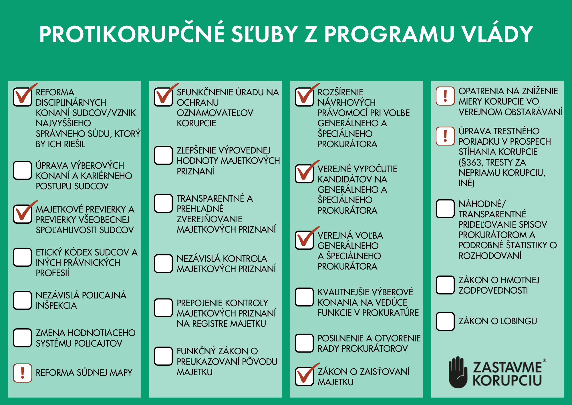Z pohľadu boja proti korupcii si verejnosť túto vládu zapamätá vďaka práci NAKA a Úrad špeciálnej prokuratúry, ktoré začali rozplietať korupčné siete z bývalých volebných období. “Ak však má byť protikorupčné nastavenie spoločnosti trvalé, musia ho sprevádzať aj systémové zmeny,” konštatovala Z. Petková. Súčasnej koalícii navyše Nadácia vyčíta, že nemá vždy rovnaký meter na bývalých a súčasných nominantov. Napríklad, keď nevyvodila politickú zodpovednosť za podozrivé diplomovky (I. Matovič, Boris Kollár, Branislav Gröhling) a spochybňuje trestné konanie a dôveryhodnosť polície, ak vyšetruje jej politikov (Vladimír Pčolinský, Monika Kavecká).
